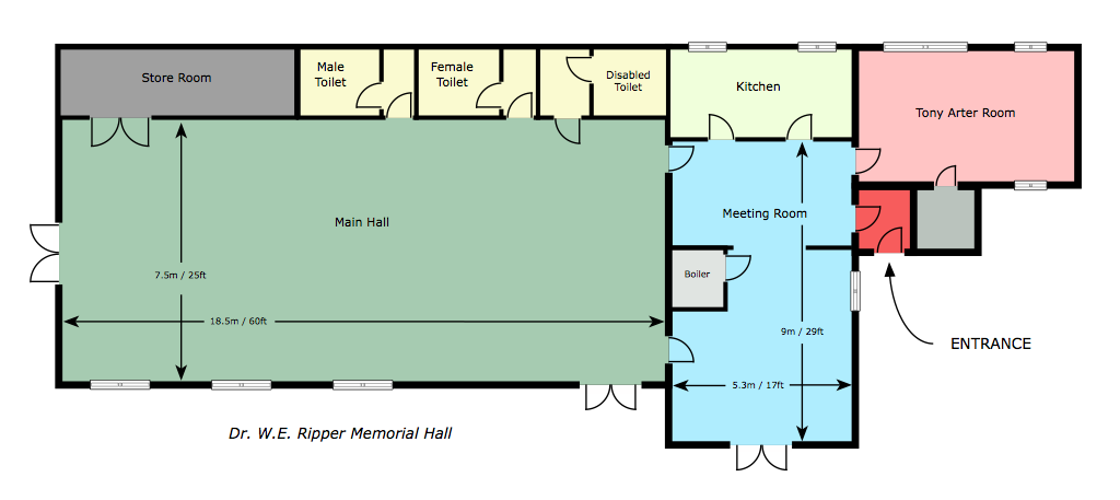 If the whole of the hall is not required, the separate sections of the hall can be booked individually. These can be seen in more detail by clicking on this layout thumbnail image.